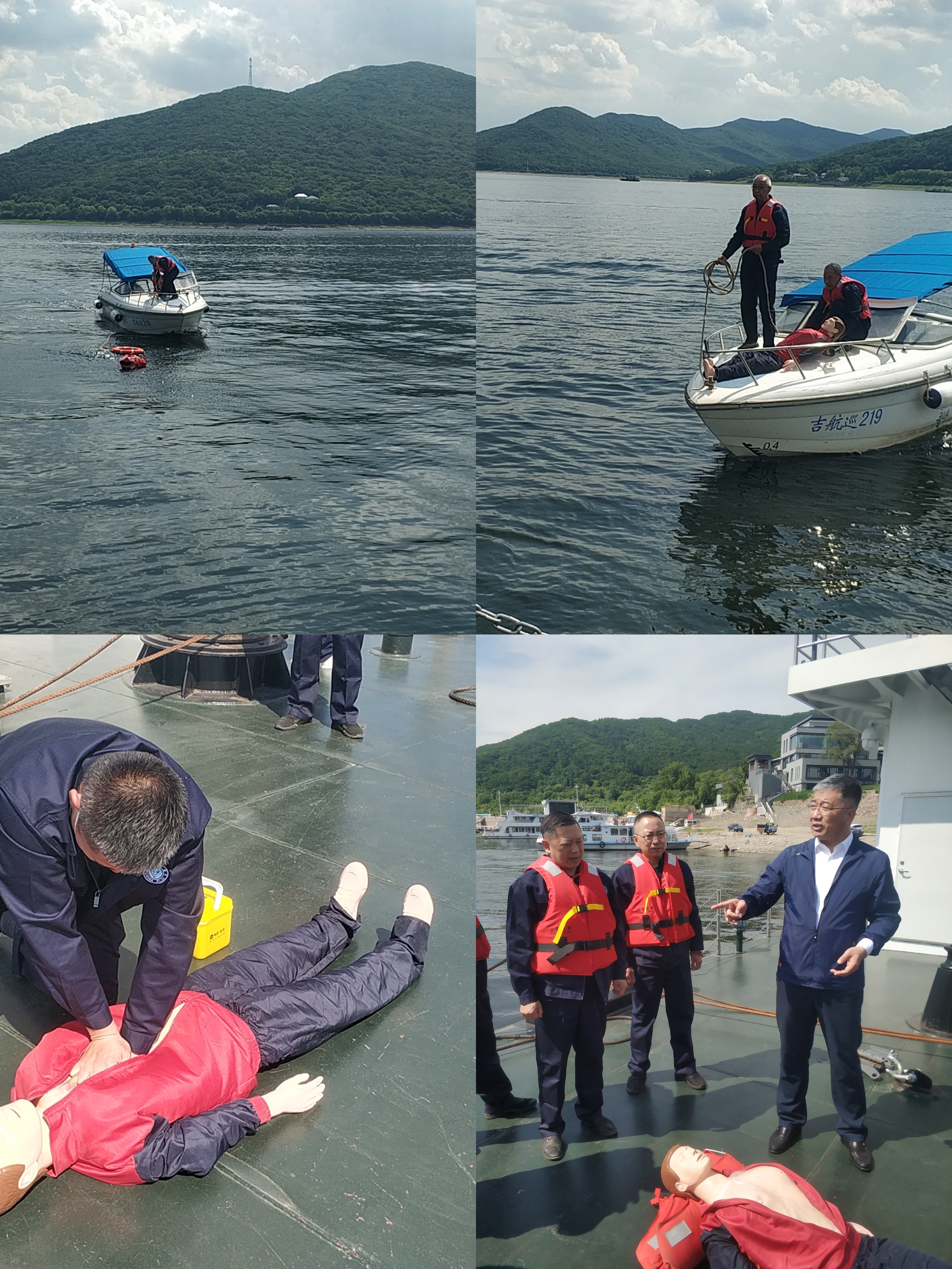 溺水救援演练在松花湖库区开展。吉航趸211号船员发现附近水域中有1名溺水人员,该船员立即向现场指挥组报告,现场指挥组立即启动救援预案,派出吉航巡219号快艇迅速赶往该水域将溺水者救上快艇,经多人密切配合将溺水者转移至趸船甲板,进行急救处理并恢复“心跳”,由120转运至医院,最终成功救助了该名溺水者。