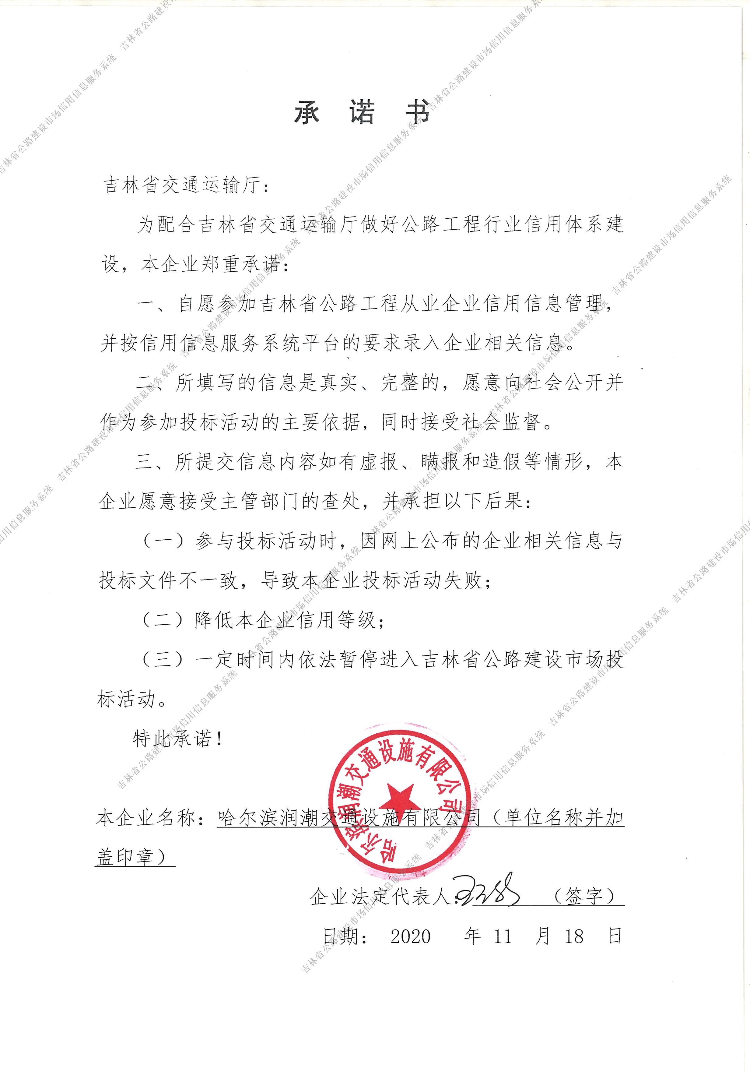 哈尔滨润潮交通设施有限公司信用承诺书