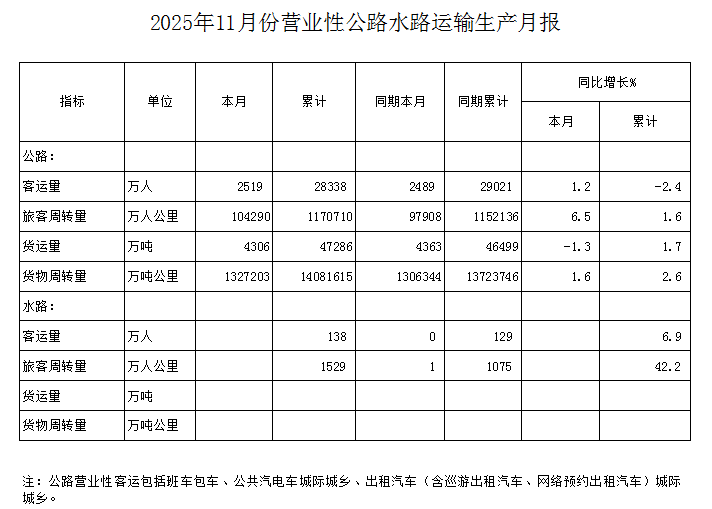 2025年11月份营业性公路水路运输生产月报