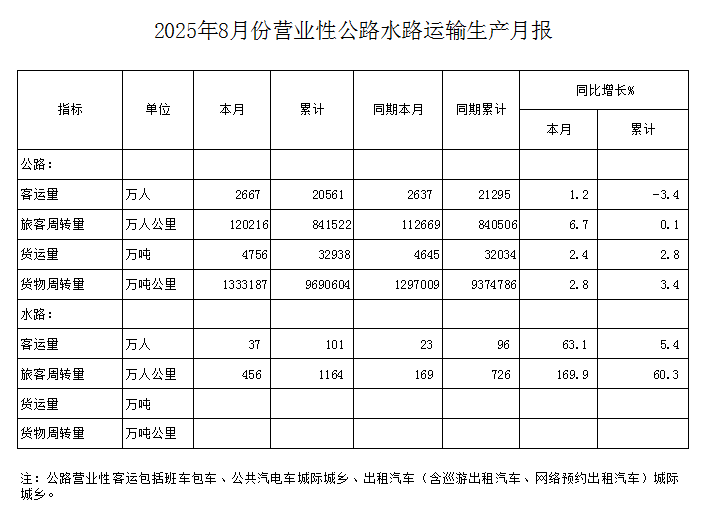 2025年8月份营业性公路水路运输生产月报
