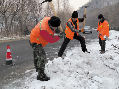 汪清县日兴公路养护有限公司积极做好除雪防滑工作。图为养护人员在省道201线绥东公路83公里+600米处处置冰湖。(申虎植 刘强)