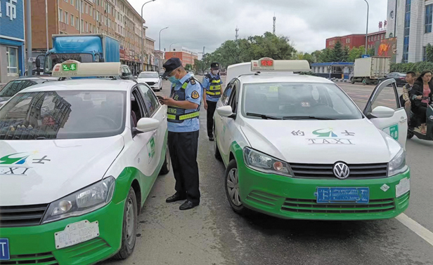 近期,榆树市交通运输综合行政执法大队持续加大执法力度,图为执法人员在市区检查出租汽车驾驶员从业资质。(于林澄)