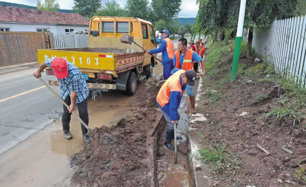汪清县日兴公路养护有限公司采取有效措施,加大公路巡查力度,确保汛期管养公路安全畅通。图为养护人员在三莫公路200公里+800米处进行清淤作业。(申虎植 刘强)
